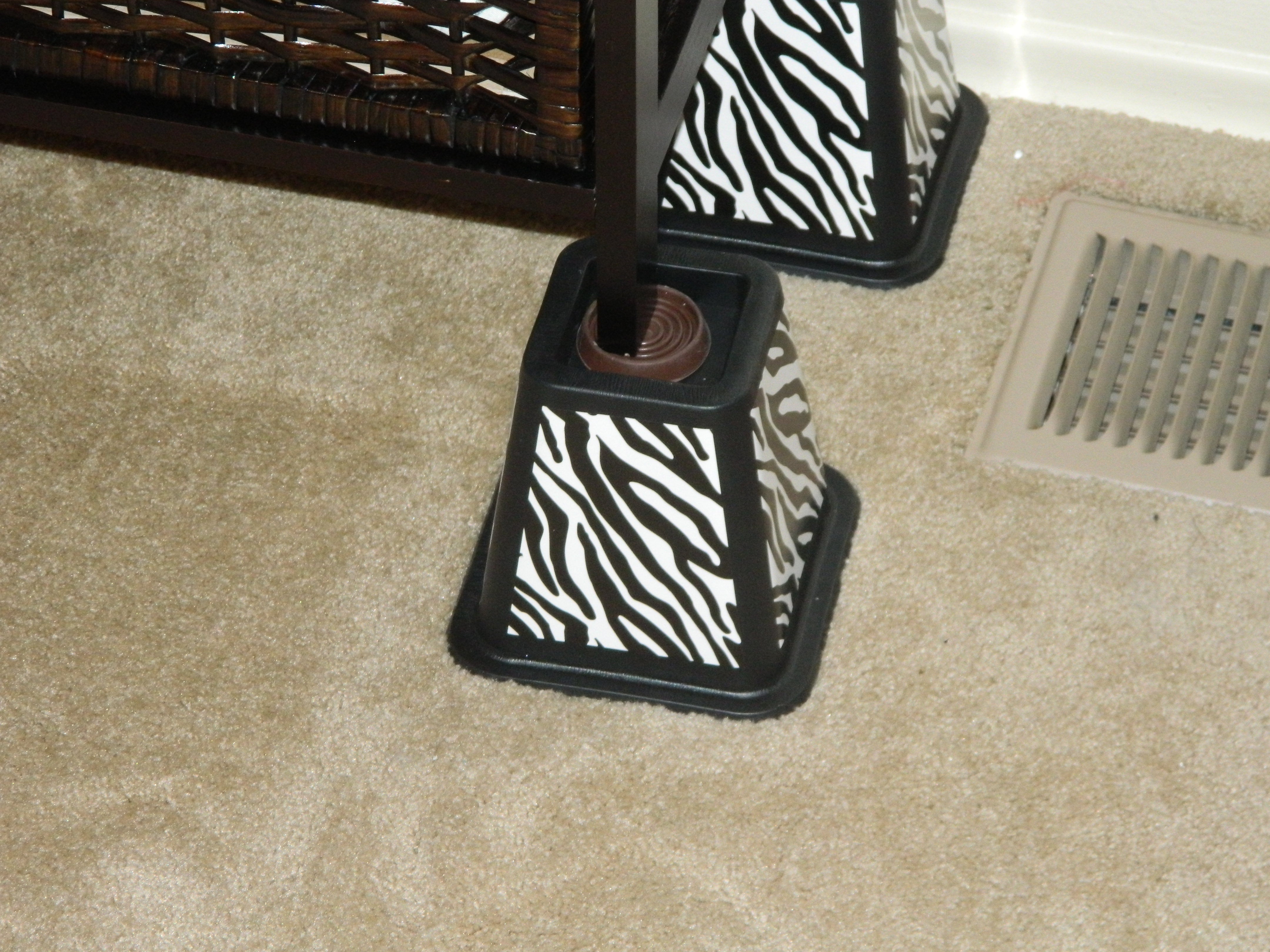 The issue rested until that afternoon, when Liz declared her intentions to do some shopping at Ross and Marshall’s, a trip she returned from with the usual Ross and Marshall’s fare, along with a set of four zebra-striped furniture risers (these significantly taller than the little disks) seen here: